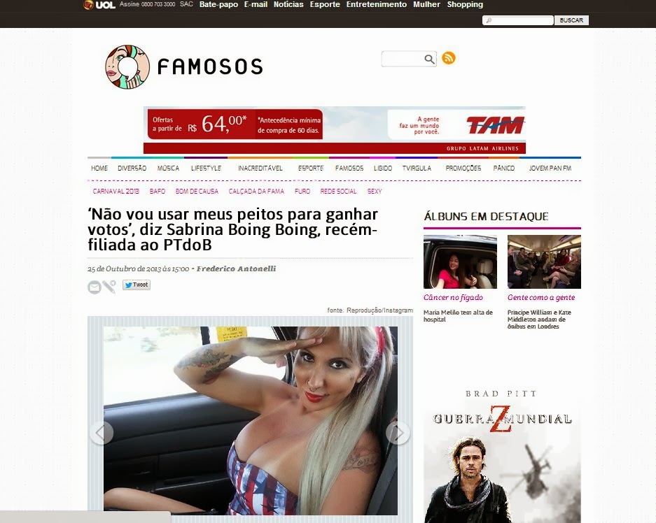 “Já há algum tempo, partidos me procuram para eu me candidatar, mas eu sempre disse não”, disse ela que desta vez aceitou o convite. “Eles falaram que eu represento uma figura popular, que se comunica bem com o público jovem. Todo ano eles precisam de alguém com esse apelo popular. Eles estimam que eu consiga cerca de 30 mil votos”, completou Sabrina.